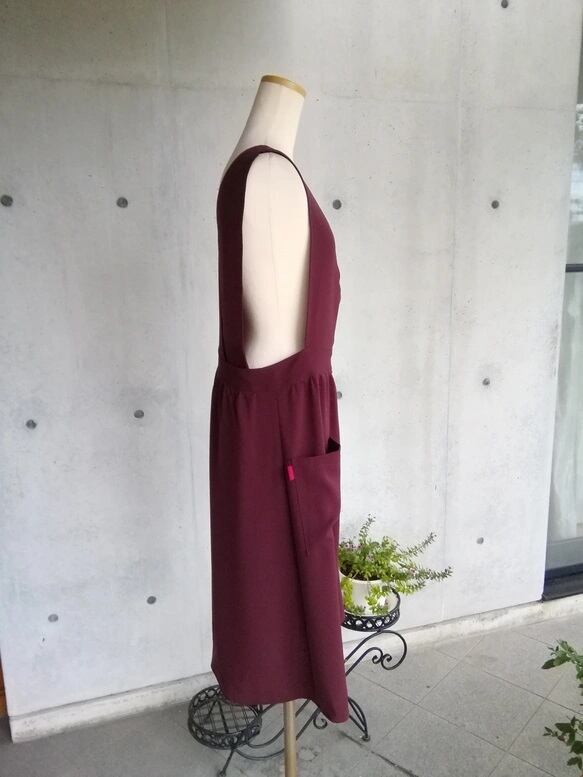 紐を結んだり、締め付け感が無いように、すぽっとかぶれるタイプのエプロンです。 腰回り、お尻もすっぽりかくれるデザインで、後ろは重なっているだけなので、動きに合わせて自由自在に変化し、動きやすいです。