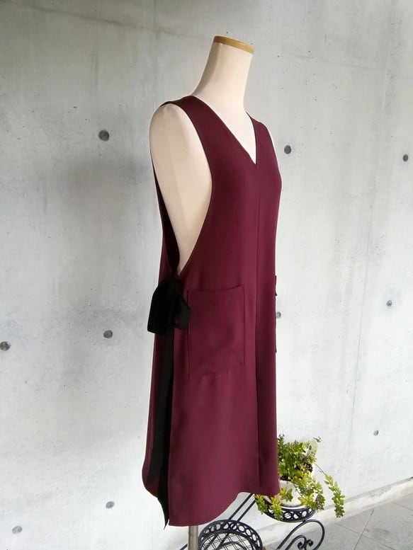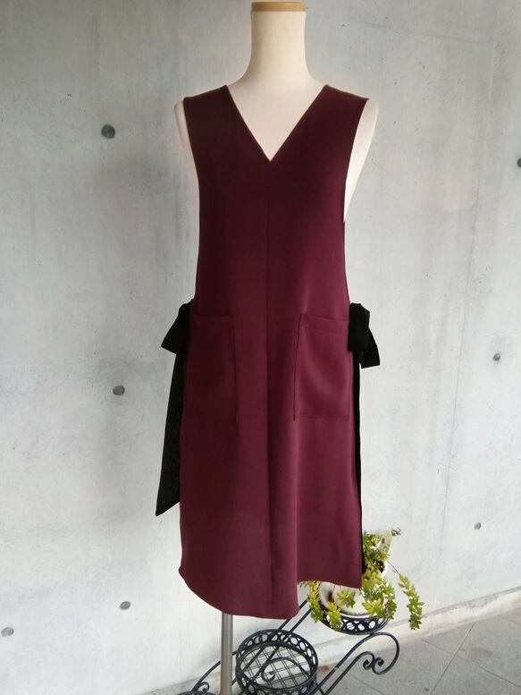 【日本製】《7L~10L》梨地ストレッチ ボルドー 脇配色リボンで調節可能なかぶって結ぶ膝丈エプロン 137100-50 | 大きいサイズエプロン 可愛い日本製の大きいサイズエプロン通販【lueel】